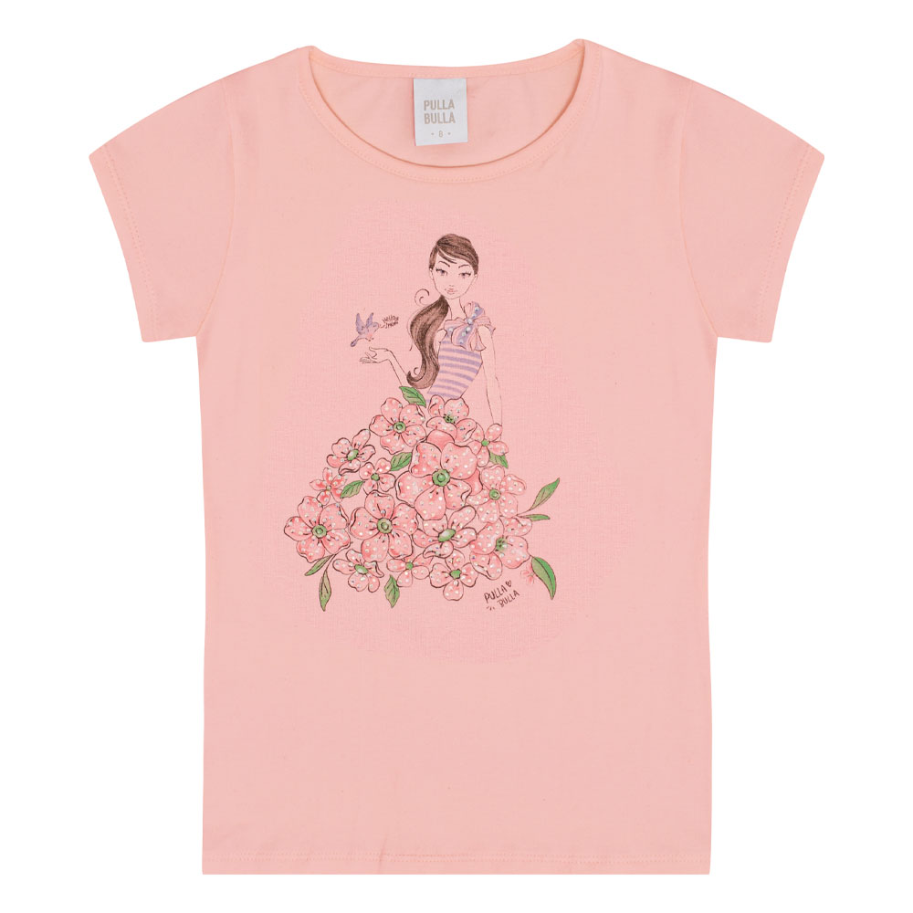 Blusinha fresquinha em cotton leve na cor rosê, ideal para usar no dia a dia e aproveitar os dias de sol. Com gola arredondada e estampa de menina com flores e strass. Uma fofura.