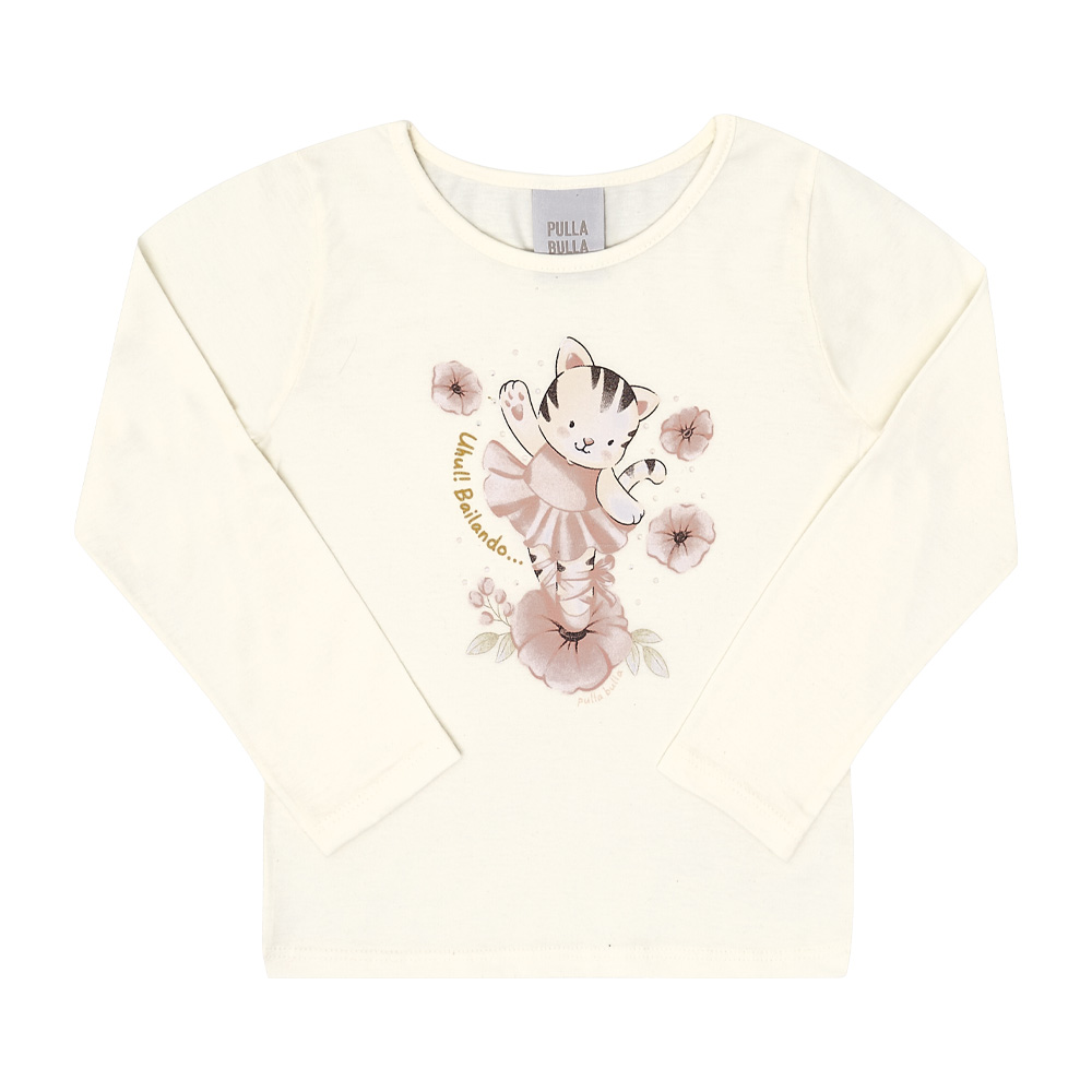 Blusinha de manga longa ideal para meia estação. Confeccionada em meia malha na cor off white, a blusa possuí estampa frontal de gatinha bailarina e o detalhe em strass na estampa é o charme da peça. Sua fofurinha vai adorar se divertir cheia de conforto.