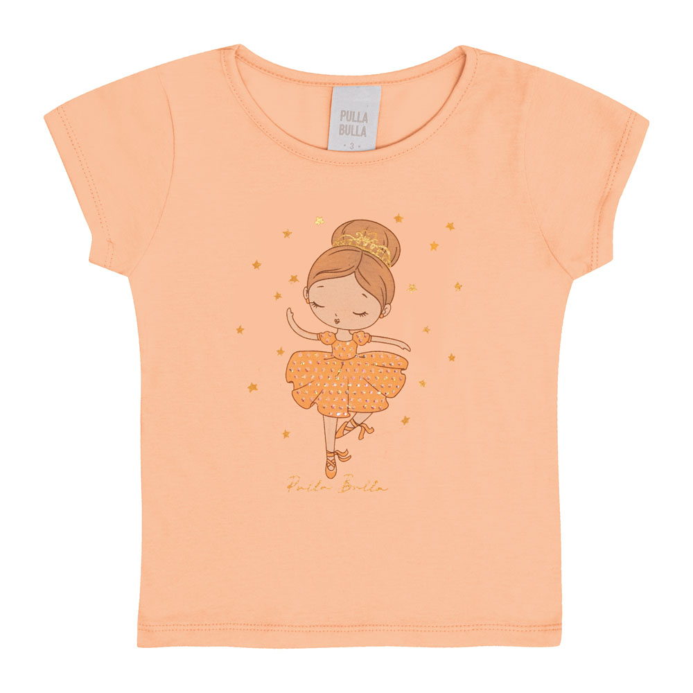 Aposte nesta peça para combinar com amiguinha! Confeccionada em tecido meia malha a blusa possuí estampa frontal de bailarina na cor pêssego e aplicação de strass, a gola arredondada traz charme e fofura para a peça.