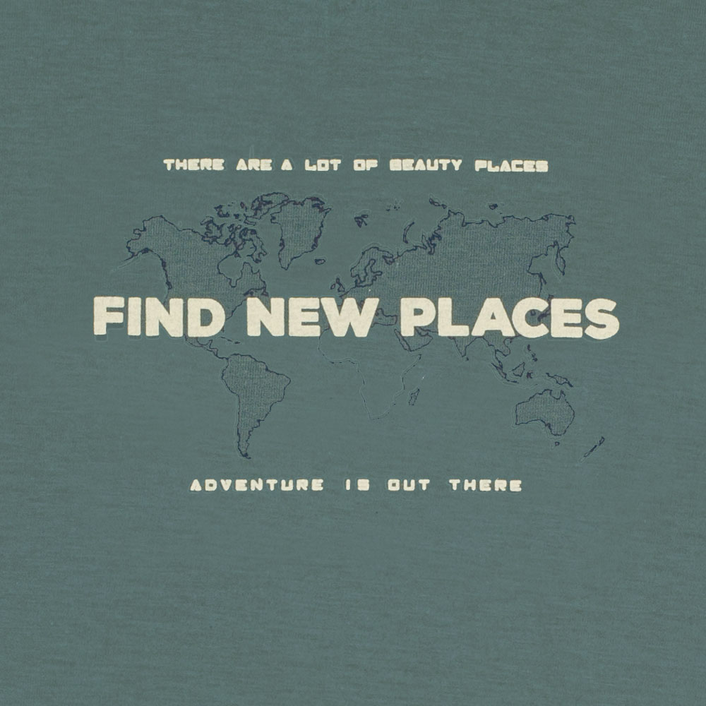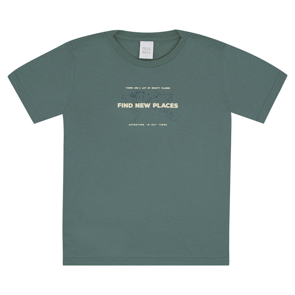 Camiseta masculina infantil confeccionada em meia malha na cor floresta, com uma estampa em puff divertida que apresenta um mapa-múndi e escritas inspiradoras, despertando a imaginação para grandes aventuras. Perfeita para fugir dos dias quentes, proporcionando conforto e estilo enquanto os pequenos exploram o mundo ao seu redor com muita criatividade