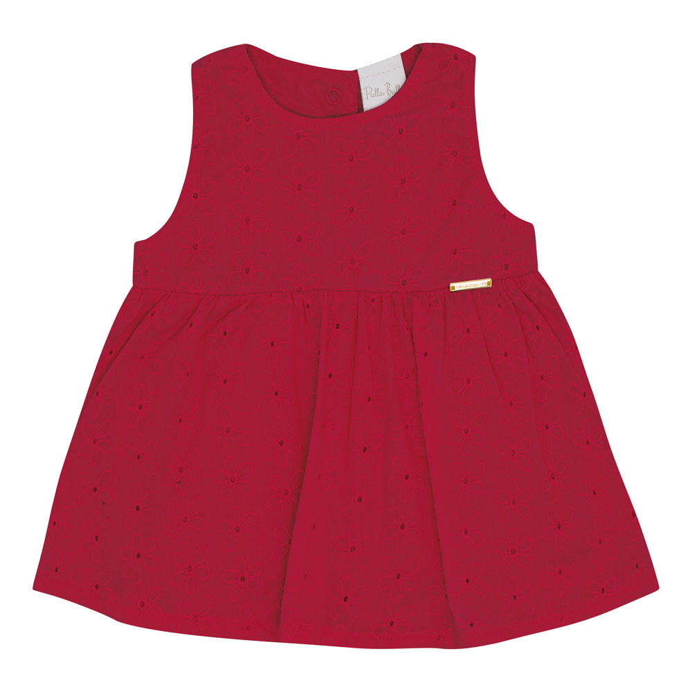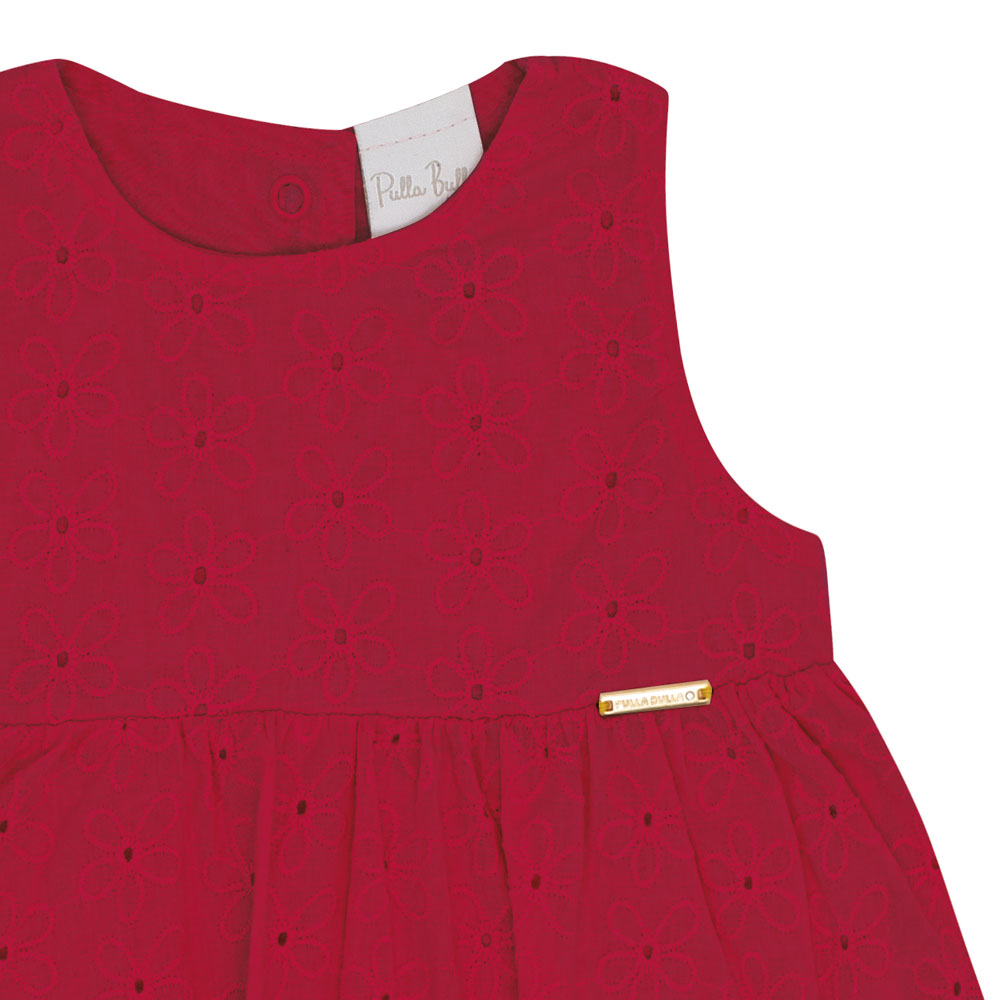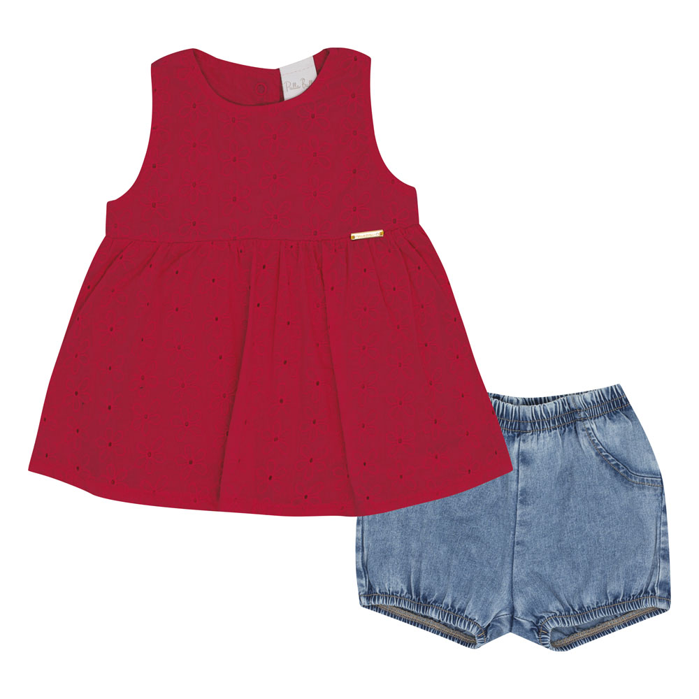 Conjunto bebê feminino composto por uma blusa em tecido laise na cor vermelha, modelo regatinha, que traz frescor e delicadeza ao visual. A peça conta com uma plaquinha de metal próximo ao peito com a identificação da marca Pulla Bulla, adicionando um detalhe especial. O short na cor índigo médio é confeccionado em jeans leve com elastano, proporcionando conforto e liberdade de movimento para a criança. Uma combinação perfeita para os dias mais quentes, unindo estilo e praticidade.