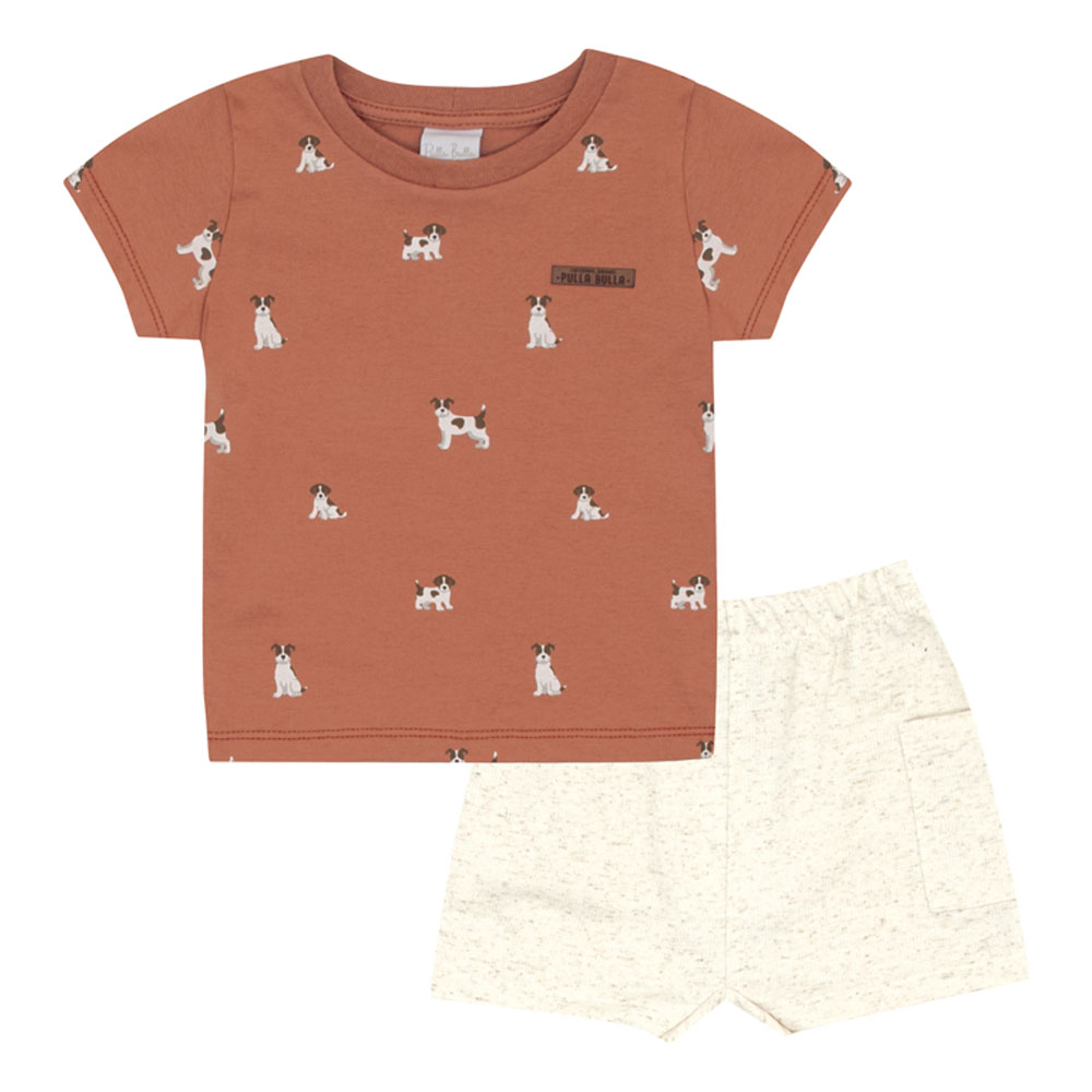 Conjunto bebê masculino composto por uma camiseta na cor ferrugem em meia malha com estampa divertida de cachorrinhos por toda a peça e um aplique termocolante próximo ao peito com a identificação Pulla Bulla. A bermuda na cor natural é confeccionada em moletom linho, com bolso lateral e cintura com elastano, garantindo conforto e praticidade para o bebê. Perfeito para os dias quente!