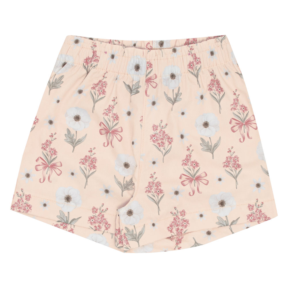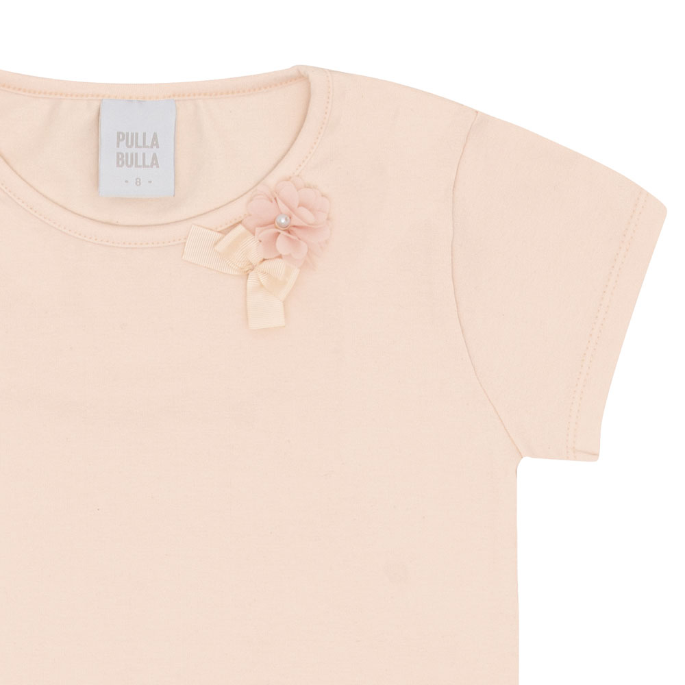 Conjunto composto por uma blusa em cotton leve trabalhado na cor rosa pó com aplique de laço e flor com pérola próximo à gola. O short rosa pó é confeccionado em sarja leve, com elástico na cintura para maior conforto e estampa digital florida que completa o visual com elegância. Ideal para usar em passeios de família!