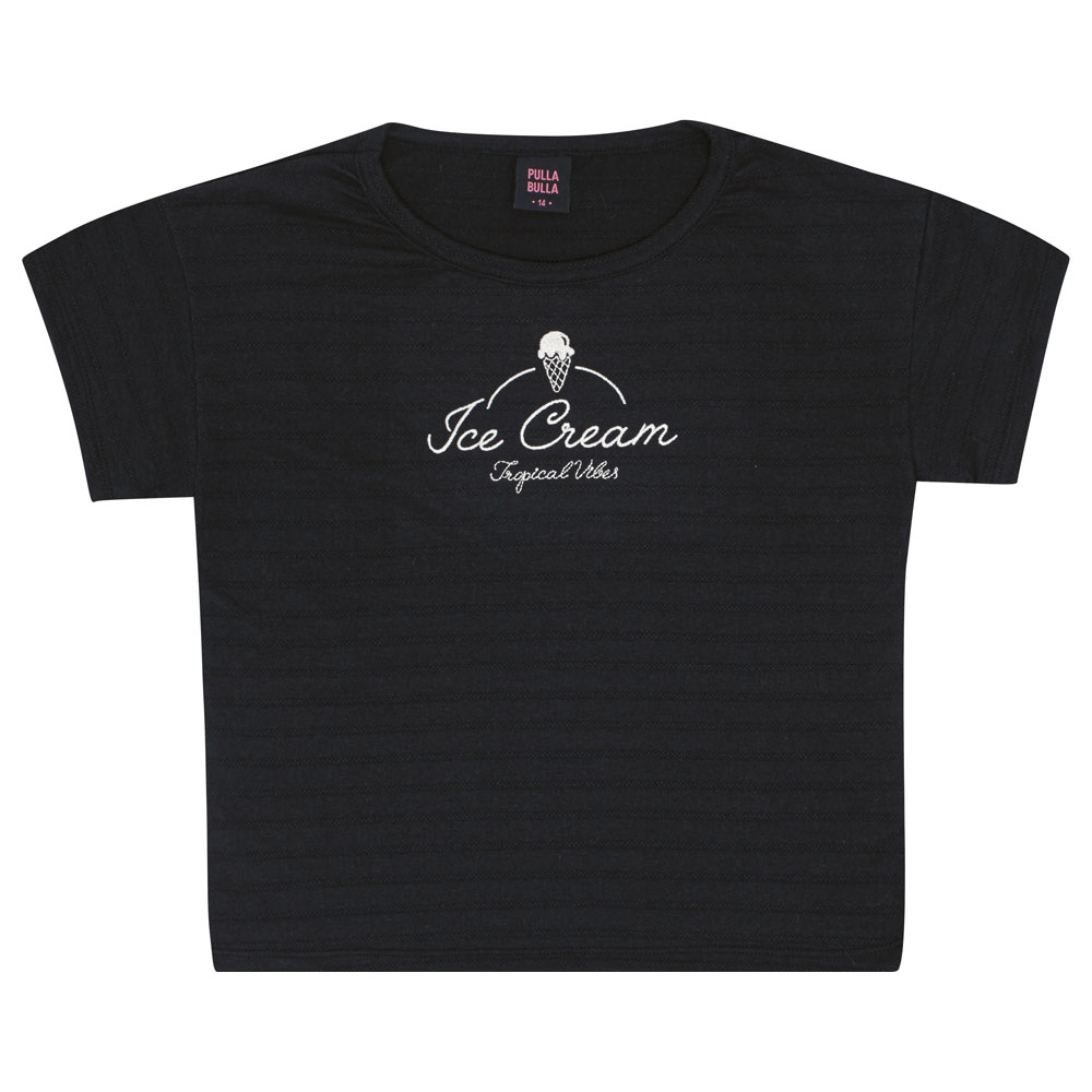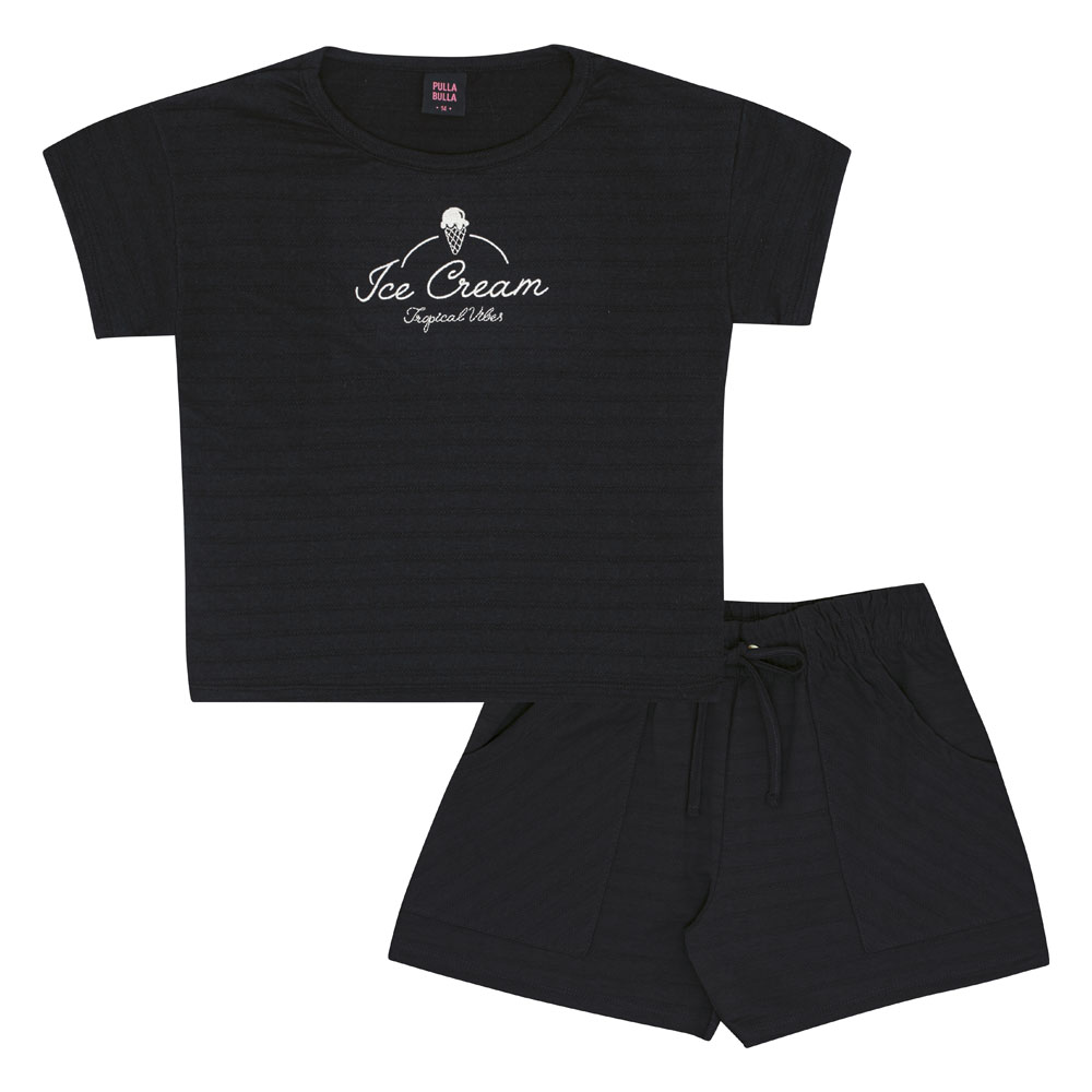 Esse conjunto na cor preto incrível traz uma blusa em malha trabalhada com um bordado fofo de sorvete e a frase ‘Ice Cream’ que é pura diversão. O short, com cintura de elastano e bolsos laterais, completa o visual com conforto e praticidade.