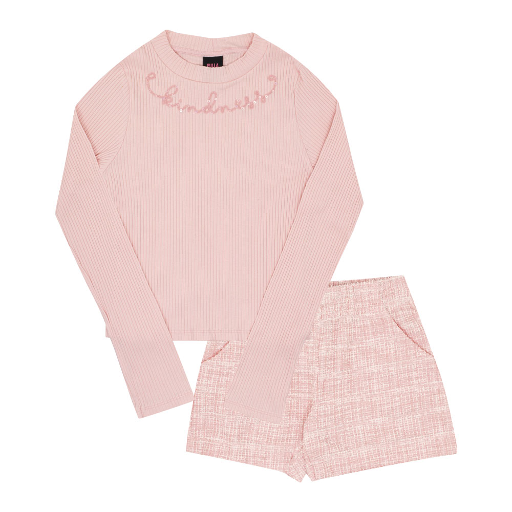Um look cheio de charme e estilo para arrasar em qualquer ocasião! A blusa em malha canelada rosê traz um toque delicado com o bordado “kindness” no decote, enquanto o short em tweed imprime sofisticação com conforto. Ideal para compor produções casuais com um toque fashionista.
