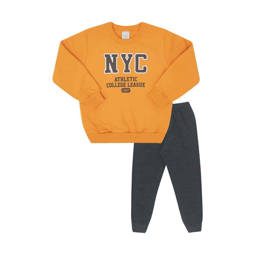 O conjunto colegial vai ser o favorito do seu pequeno fashionista. Confeccionado em moletom, o blusão na cor ocre possuí elastano na barra e nos punhos, garantindo conforto e bom caimento da peça, o detalhe destaque do blusão é a sua estampa em puff com o letreito NYC – Liga atlética da faculdade. Seu pequeno fashionista irá adorar se sentir um galã estudante. A calça na cor mescla preto vai garantir conforto durante o dia.