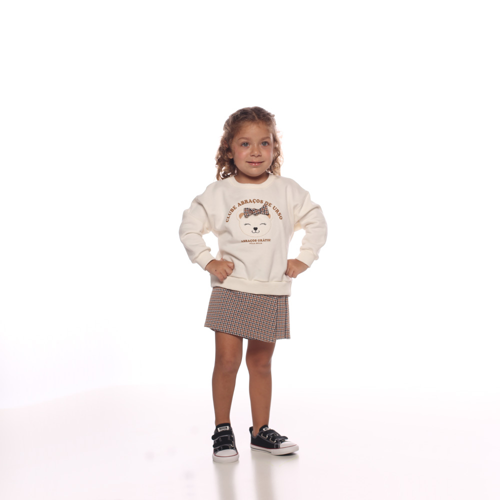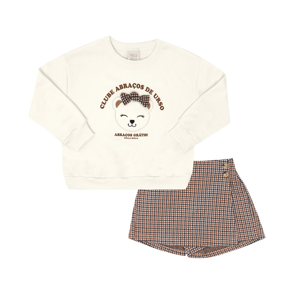 O passeio ao shopping com a dinda irá se tornar um desfile para sua pequena fashionista. O conjunto possuí short saia xadrez marrom com elastano na cintura para maior conforto, o blusão moletom na cor off white possuí aplique interativo bordado de ursinha. É ou não uma graça esse conjunto?!
