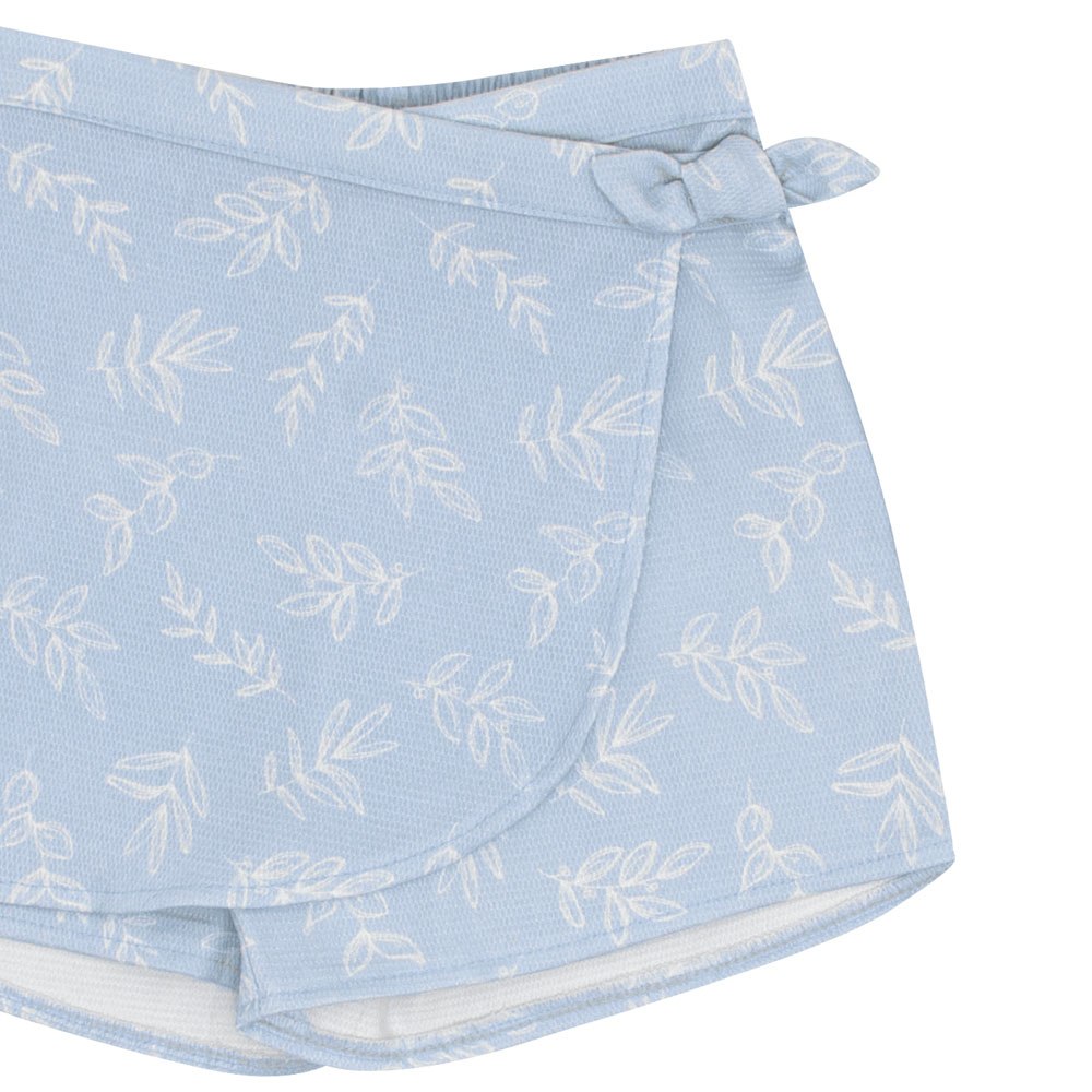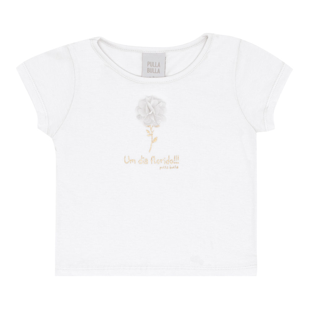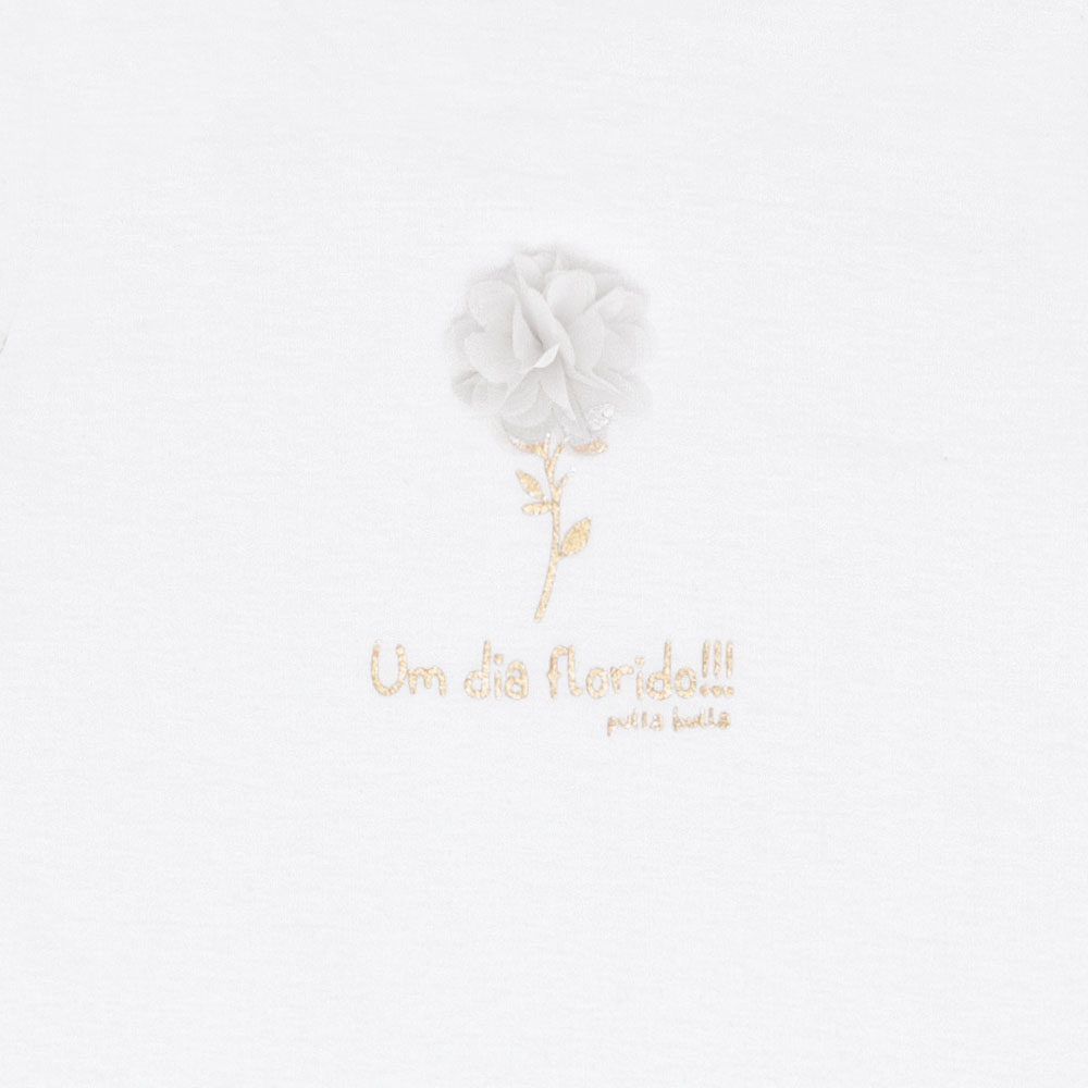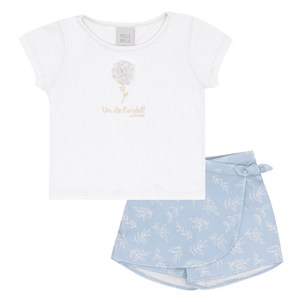 Conjunto primeiros passos feminino composto por uma blusa em meia malha na cor branco com um delicado aplique de flor interativo, detalhes em foil e a escrita ‘Um dia florido’, trazendo um toque encantador à peça. O short saia é confeccionado em tecido maquinetado na cor digital hortênsia com uma estampa digital de folhas por toda a peça, unindo estilo e conforto. Perfeito para criar looks leves e charmosos para os dias quentes.