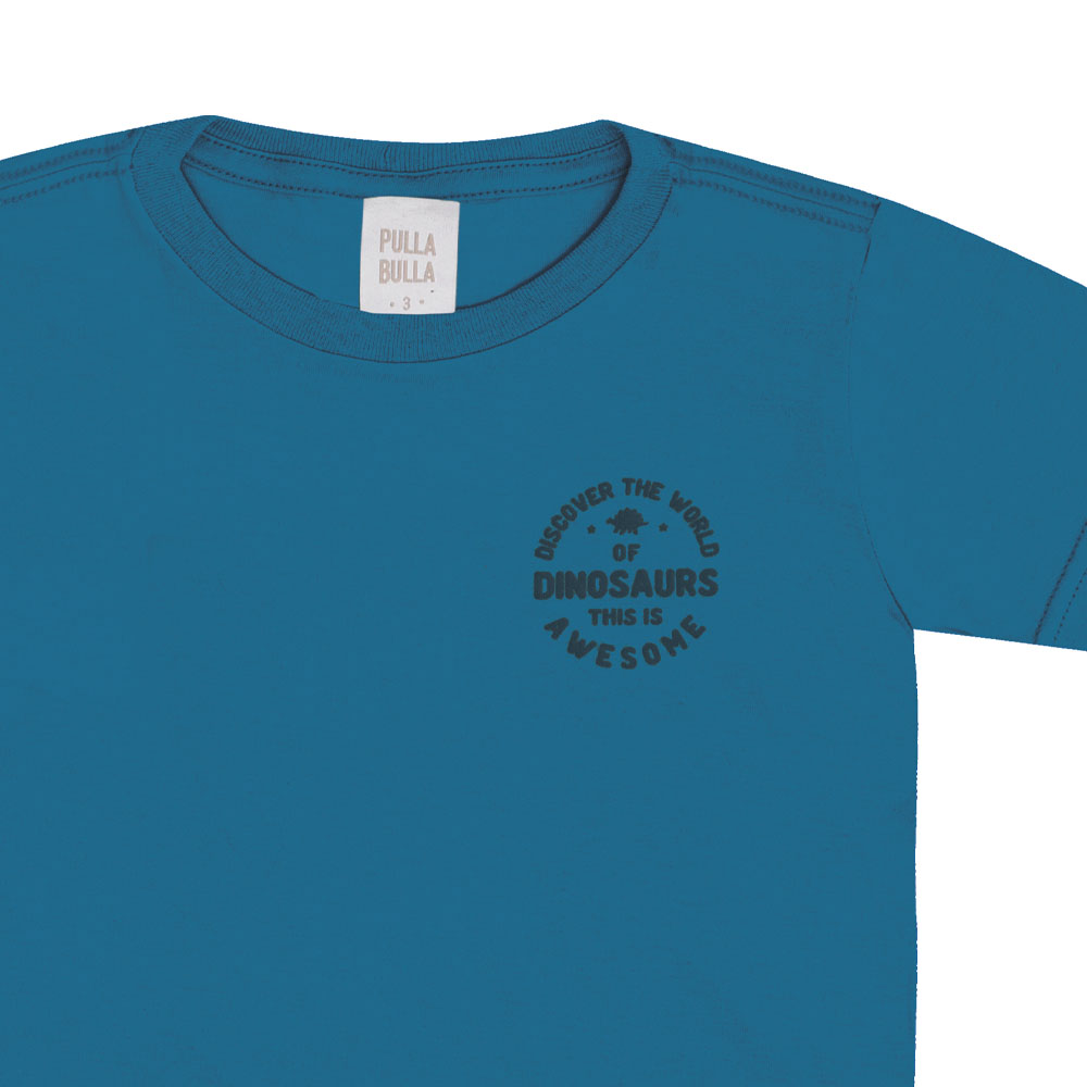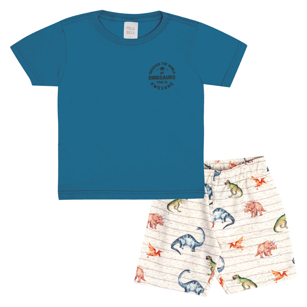 Uma nova aventura jurássica esta preste a começar! Aposto no conjunto mundo dos dinos para seu pequeno explorador brincar estando confortável e estiloso, conjunto composto pela camiseta meia malha na cor azul cobalto com estampa puff de dinossauro com escrita “descubra o mundo dos dinos, isso é incrível” e a bermuda em moletom linho na cor natural sublimado com estampa de dinossauros.