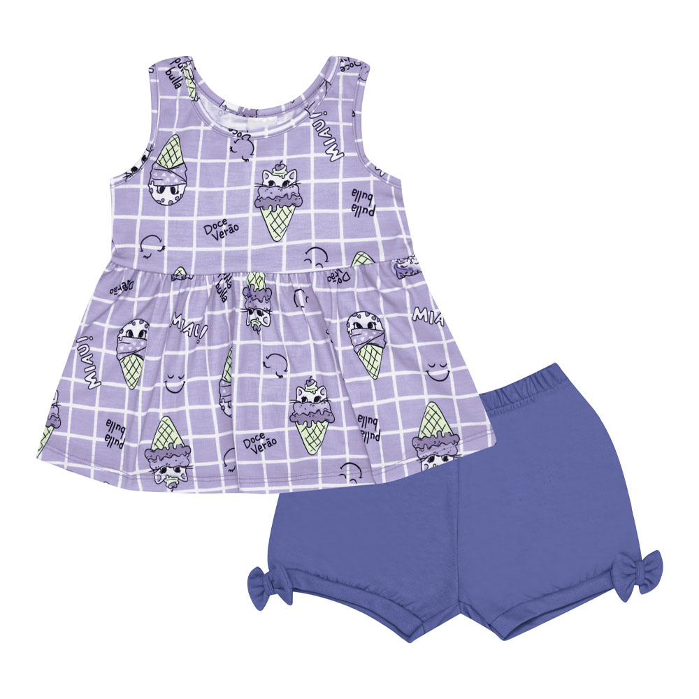Para os dias mais quentinhos, não há nada melhor que um Conjuntinho leve e fresquinho para sua menininha, pensando nisso a Pulla Bulla trouxe essa Blusa na cor Lilás confeccionado em Malha leve com estampa sublimada de sorvetinhos e um Short na cor Mirtilo confeccionado em Moletinho com detalhes de laço nas barras das pernas. Tudo para a sua princesinha aproveita ao máximo o verão.