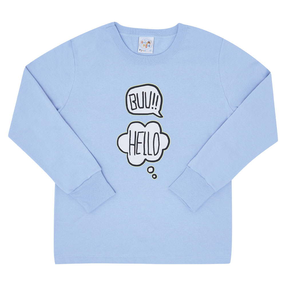 Quentinho e divertido para aquecer os meninos durante a estação. Confeccionado em moletinho, o blusão de manga longa na cor hortênsia possuí estampa frontal com escrita “buu!” “Hello” e ambas brilham no escuro também. Já a calça possuí estampa rotativa na cor hortênsia de pequenos fantasmas e seres divertidos além de possuir elastano no cós.