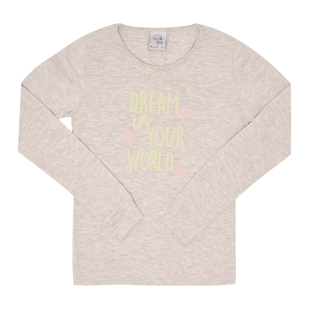 Chegou a estação mais fria do ano, é hora de pijama quentinho e confortável para o sono de beleza das meninas! O conjunto é todo confeccionado em meia malha na cor mescla banana. A blusa de manga longa possuí estampa frontal com escrita “Sonhe em seu mundo” e o detalhe divertido da peça é que a estampa brilha no escuro. A calça além de proporcionar conforto e segurança por ter elastano na cintura, possuí também estampas de coelhos nas laterais da perna.