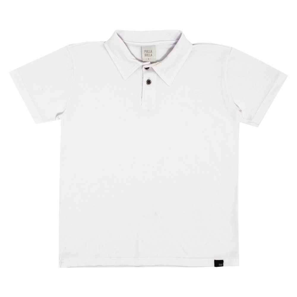 Para momentos especiais, passeios ou festas seu fashionista merece um look moderno e confortável. Confeccionada em piquete com elastano na cor branca, a camiseta polo conta com gola em fechamento de botões, bordado frontal com escrita “Pulla Bulla”. Básica e fashionista para combinar com bermudas da coleção.