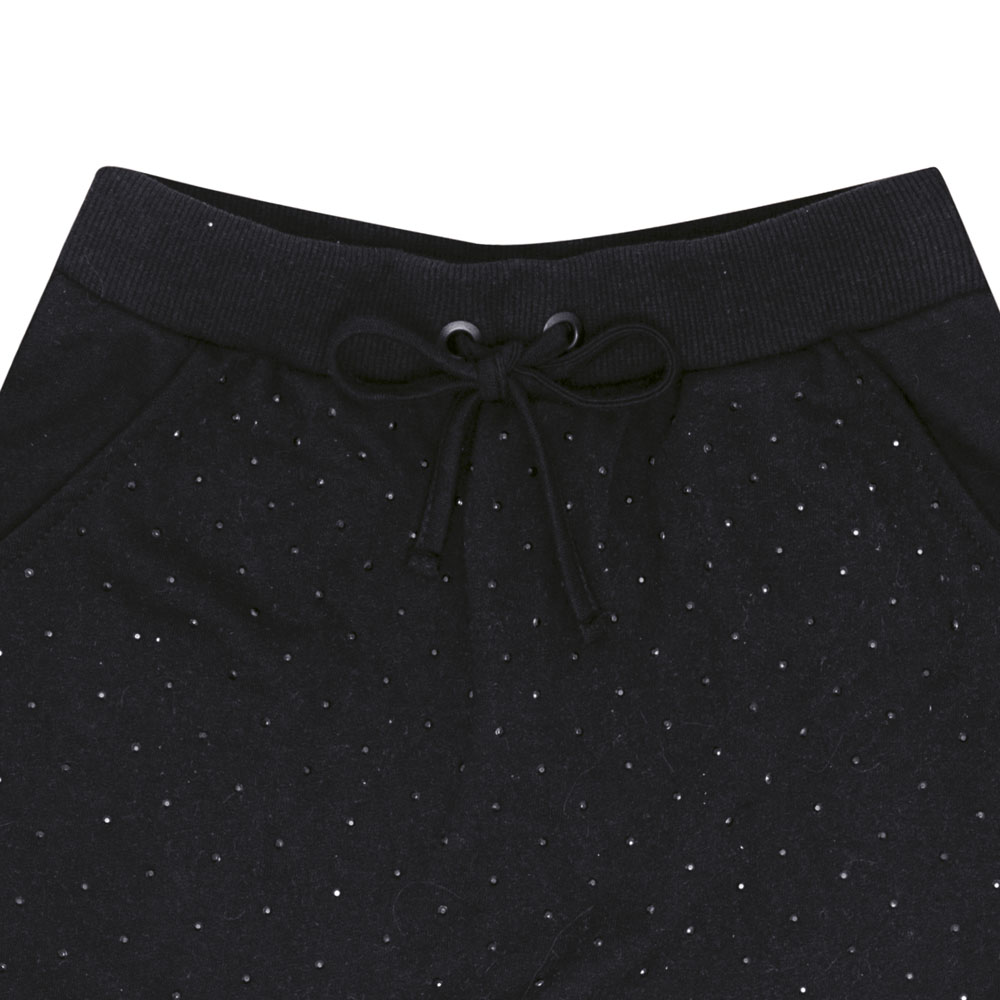 Short saia confeccionado em moletinho na cor preto, com aplicação de strass na parte frontal, trazendo brilho e elegância à peça. O modelo conta com bolsos laterais para praticidade e elástico reforçado na cintura, garantindo conforto e segurança durante o uso. Uma escolha charmosa e funcional para diversas ocasiões.