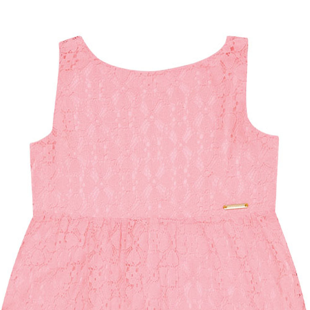 O vestido rendado vai fazer sucesso entre as amiguinhas! Confeccionado em tecido meia malha na cor rosa lumi, o vestido possuí sobreposição em renda e pequena placa de metal com identificação Pulla Bulla frontal. Livre, confortável e fashion!
